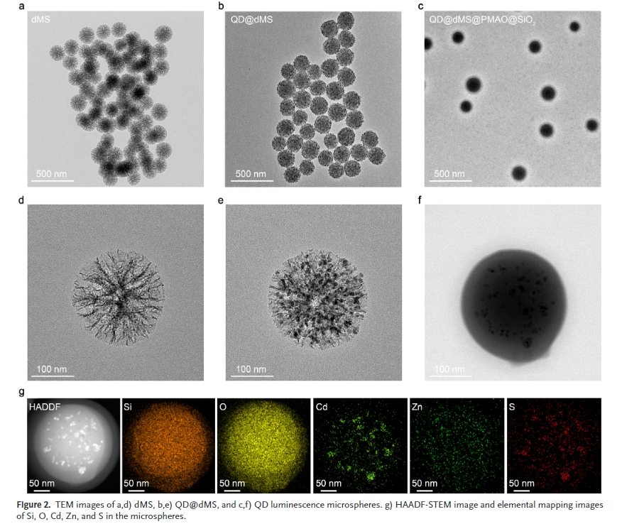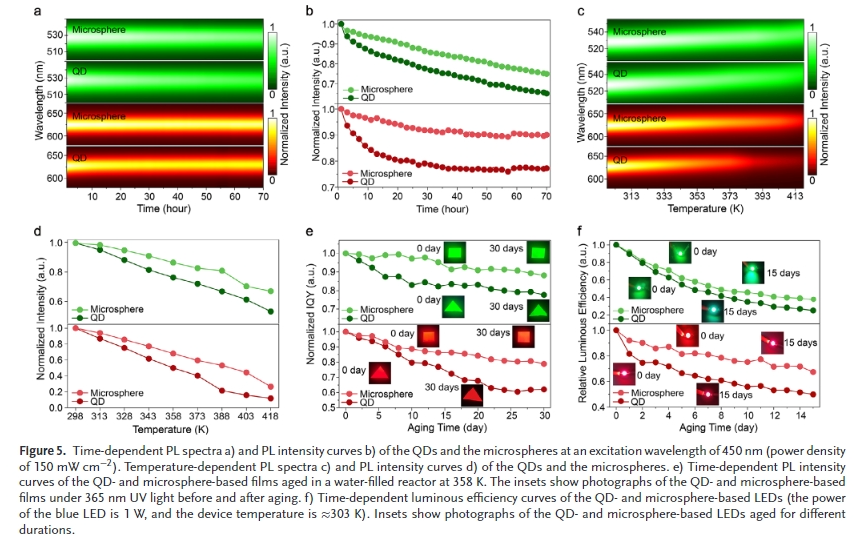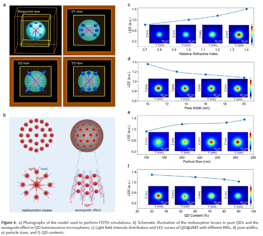 樹突狀介(jie)孔硅球(dms)具有(you)直徑可調、介(jie)孔豐富、高折射率、優異的(de)(de)(de)光(guang)學(xue)透過率和較強的(de)(de)(de)化(hua)學(xue)穩(wen)定(ding)性(xing)等特點。因此,將量(liang)子點封(feng)裝在dms的(de)(de)(de)介(jie)孔中,可以提高量(liang)子點的(de)(de)(de)顏色轉換性(xing)能(neng)和可靠(kao)性(xing)。介(jie)孔的(de)(de)(de)空間限制(zhi)作用降低了(le)量(liang)子點的(de)(de)(de)重吸收,使量(liang)子點與(yu)水和氧(yang)分離。此外,在介(jie)孔和填料之間形(xing)成的(de)(de)(de)光(guang)學(xue)微腔(qiang)改(gai)善了(le)激發光(guang)和發射光(guang)的(de)(de)(de)局部光(guang)場。然而,有(you)幾個關鍵問(wen)題需要解(jie)決,如:如何(he)在密封(feng)過程(cheng)中抑制(zhi)有(you)機(ji)配(pei)體脫落(luo)并減少對量(liang)子點表面的(de)(de)(de)損(sun)傷;封(feng)裝結構(gou)如何(he)影響顏色轉換性(xing)能(neng)。