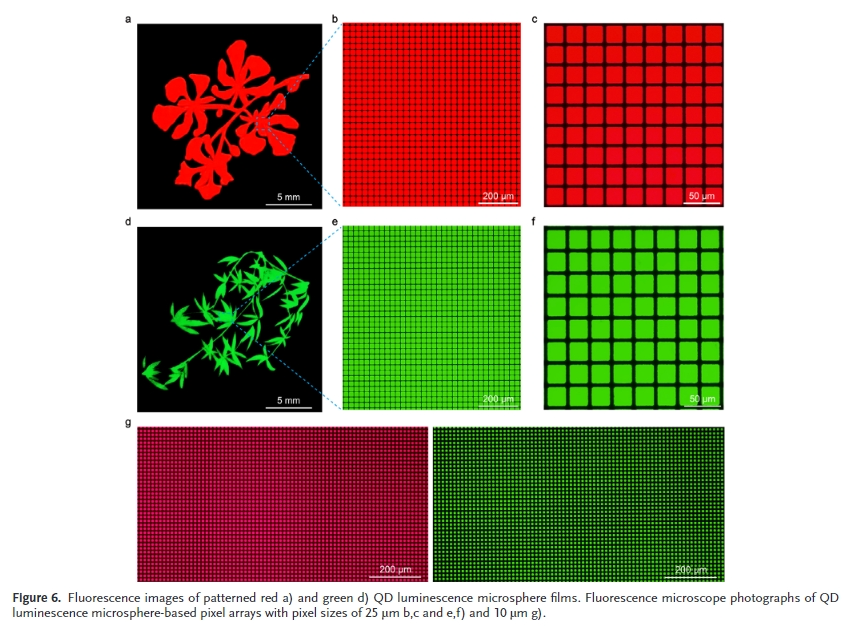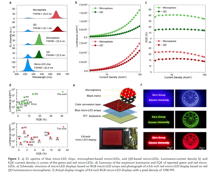 微(wei)米級發光二極(ji)管(Micro- LED)以其超高(gao)(gao)分辨率、超高(gao)(gao)亮度(du)、響(xiang)應速(su)度(du)快、高(gao)(gao)對(dui)比度(du)、低功(gong)耗等(deng)特(te)點(dian)被認為是(shi)下(xia)一代顯示技(ji)術(shu)。然而(er),傳統(tong)無機III-V半導(dao)體LED小型化到(dao)微(wei)尺(chi)度(du)(≤50µm)的過程(cheng)中,面臨著綠(lv)色(se)和紅色(se)LED輻射效(xiao)率急劇下(xia)降、傳質困難、紅綠(lv)藍(RGB)像(xiang)素驅動(dong)電(dian)壓失配等(deng)技(ji)術(shu)和性能(neng)方(fang)(fang)面的挑(tiao)戰,嚴重影響(xiang)了其商業化進程(cheng)。為了解決這些(xie)問題,采(cai)用納米級尺(chi)寸、高(gao)(gao)效(xiao)率、窄帶發射、高(gao)(gao)色(se)純度(du)的紅、綠(lv)量子點(dian)(QDs)作為顏色(se)轉換材料,與藍色(se)微(wei)型LED結合,實(shi)現了全(quan)彩微(wei)型LED顯示。該(gai)方(fang)(fang)法有(you)望簡化傳質,易于驅動(dong)電(dian)路,成本低。