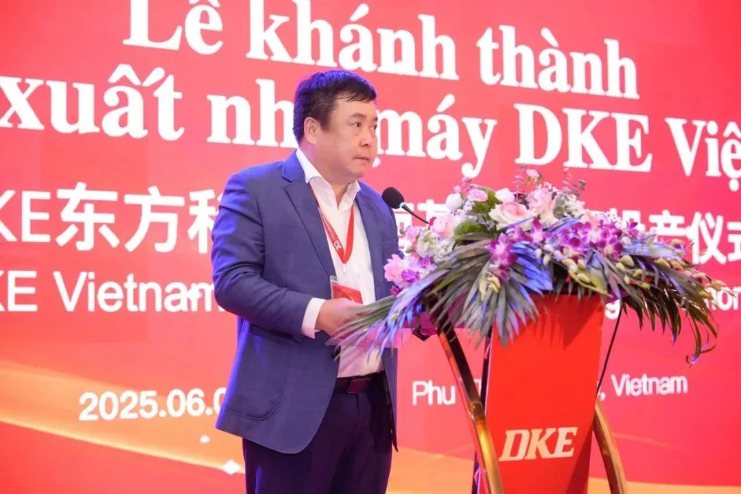 吉薩(越南)建筑與設計股份公司董事長吳友捷上臺致辭,他表示回首項目建設從藍圖規劃到破土動工,每一個環節都凝聚著雙方團隊的心血與智慧。作為曾經的建設者,將持續關注DKE越南基地的運行與發展,也衷心期待以此次合作為契機,未來能與DKE東方科脈建立更加緊密、深入的伙伴關系,在更廣闊的領域攜手并進。