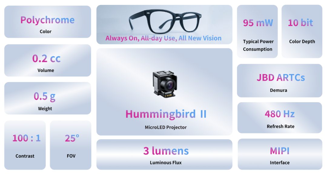 JBD公司(si)表示:“蜂鳥Ⅱ是我們(men)在消費級AR領域(yu)的一項關(guan)鍵突破(po),它(ta)將彩(cai)色顯示融(rong)入(ru)極致(zhi)尺寸之中(zhong),延續(xu)了(le)JBD在MicroLED光引擎小型化(hua)、低功耗、高亮度(du)方(fang)面的領先優勢。依托(tuo)JBD在近眼(yan)顯示領域(yu)的不斷創(chuang)新(xin),蜂鳥Ⅱ為輕量化(hua)全彩(cai)AR智(zhi)能眼(yan)鏡(jing)打開了(le)全新(xin)增長曲線。”