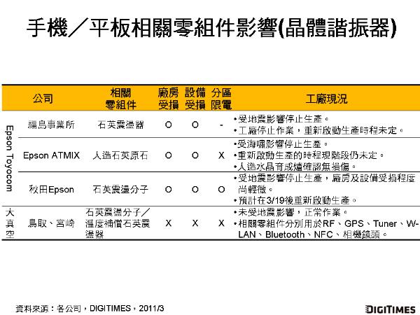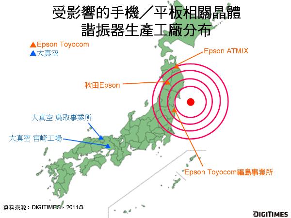 在晶體諧振器方面,負責生產石英震蕩器等相關零組件的Epson Toyocom受地震及海嘯影響,工廠皆停止生產。