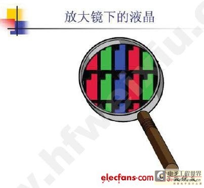 如果你拿著放大鏡去觀察液晶面板的話,你會發現如下圖中所顯示的樣子。 我們知道紅色、藍色以及綠色是所謂的三原色。也就是說利用這三種顏色,便可以混合出各種不同的顏色。很多平面顯示器就是利用這個原理來顯示出色彩。我們把RGB 三種顏色,分成獨立的三個點,各自擁有不同的灰階變化,然后把鄰近的三個RGB 顯示的點,當作一個顯示的基本單位,也就是pixel。那這一個pixel,就可以擁有不同的色彩變化了。然后對于一個需要分辨率為1024*768的顯示畫面,我們只要讓這個平面顯示器的組成有1024*768個pixel,便可以正確的顯示這一個畫面。在圖中,每一個RGB 的點之間的黑色部分,就叫做Blackmatrix。它主要是用來遮住不打算透光的部分。比如像是一些ITO 的走線,或是Cr/Al 的走線,或者是TFT 的部分。因此,我們在圖中看到每一個RGB 的亮點并不是矩形,在其左上角也有一塊被black matrix 遮住的部分,這一塊黑色缺角的部份就是TFT的所在位置。