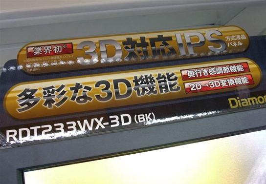 該顯示器內置的3D變換功能通過模擬視差,從而實現能以3D方式觀看2D影像或玩2D游戲的目的。但由于是通過偏光方式實現3D顯示,用戶仍需要一個20g左右的3D眼鏡而不能直接用裸眼觀看。另一特點是雖然3D可視角度在說明中上下方向只有12度,但左右可視角經日本PC Watch編輯實地體驗,比起其他偏光式3D液晶產品要大的多,站在左右向幾乎接近橫側邊的地方也能感覺到相當程度的立體感。